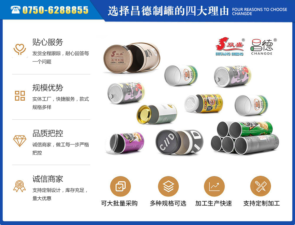 江門市昌德五金制罐有限公司位于江門與珠海臨近的古井鎮(zhèn),是專業(yè)生產(chǎn)紙罐,食品紙罐系列的包裝研制、開發(fā)、生產(chǎn)的廠家,從建廠至今,公司本著“重合同、守信用”的原則,以“質(zhì)量求生存,客戶至上”為經(jīng)營(yíng)宗旨,贏得了很好的信譽(yù),公司擁有國(guó)內(nèi)一流的技術(shù)設(shè)備和多年的生產(chǎn)經(jīng)驗(yàn)。年產(chǎn)休閑食品紙筒500萬(wàn)左右,紙筒2000萬(wàn)支左右,易拉罐,食品罐等1000萬(wàn)左右,產(chǎn)品銷往各地。我廠是以高科技為先導(dǎo),以技術(shù)創(chuàng)新整合為手段,成為迅速崛起的專業(yè)性包裝企業(yè),憑借艱苦的創(chuàng)業(yè)精神和集體智慧,采用規(guī)范的現(xiàn)代企業(yè)運(yùn)行機(jī)制,形成具有鮮明特色的企業(yè)文化模式和管理...